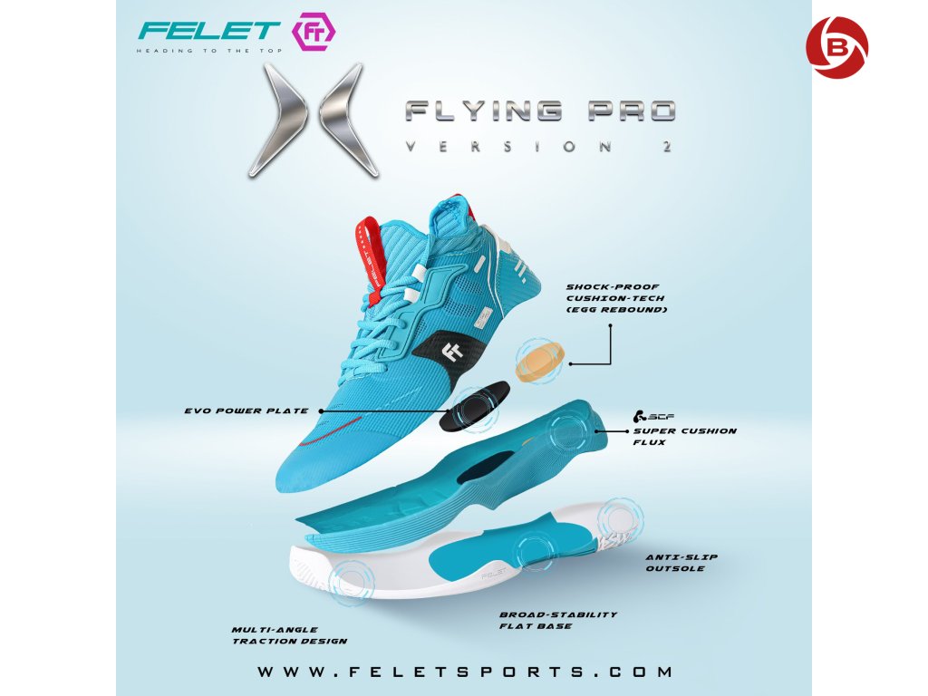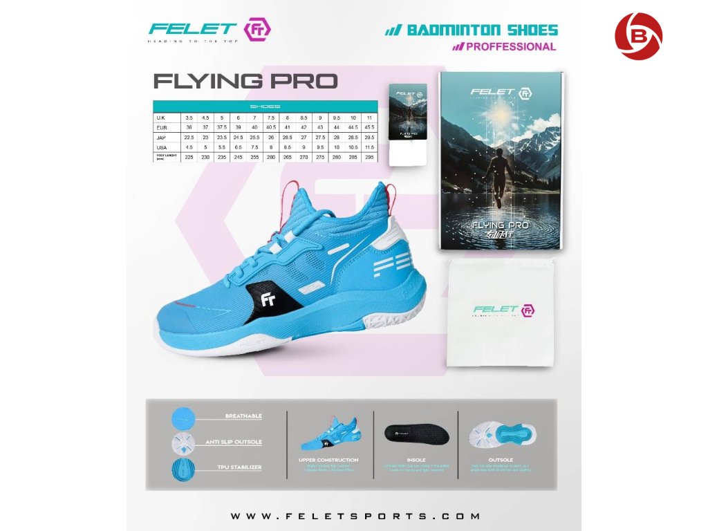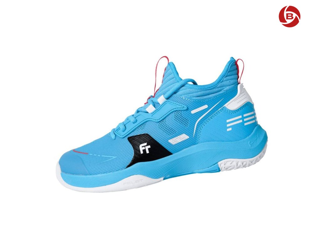 Sálová obuv Felet Flying Pro V2 Blue je druhá generace profesionální badmintonové obuvi navržené pro intenzivní zápasovou i tréninkovou zátěž. Tento model spojuje moderní konstrukci, pokročilé tlumicí technologie a výrazný sportovní design, který podtrhuje její turnajový charakter.
