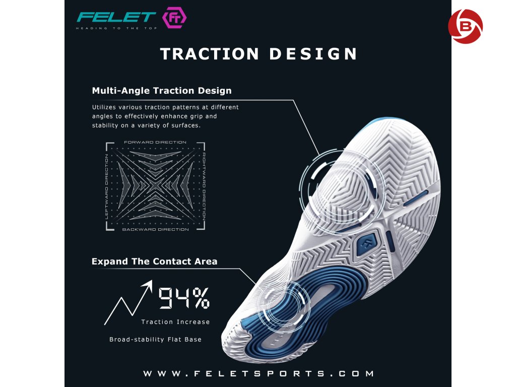 Speciálně tvarovaná podešev využívá víceúhlový trakční vzor, který zajišťuje maximální přilnavost při všech směrech pohybu.