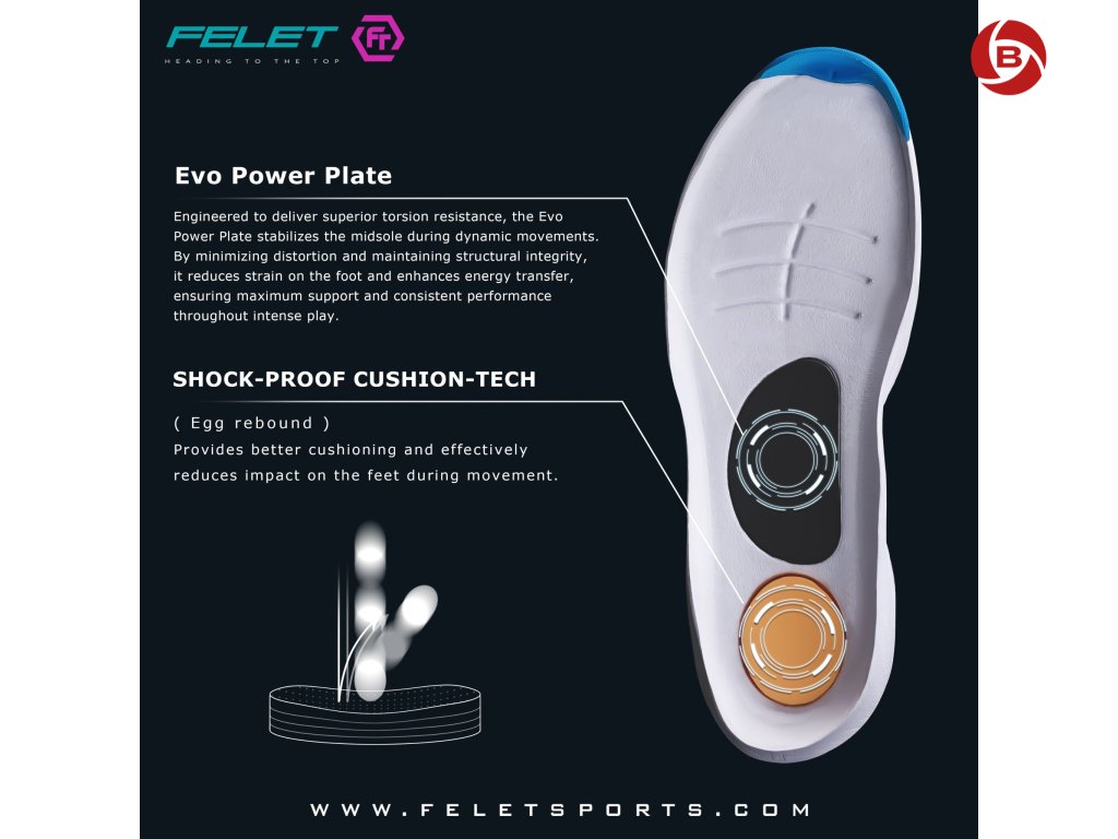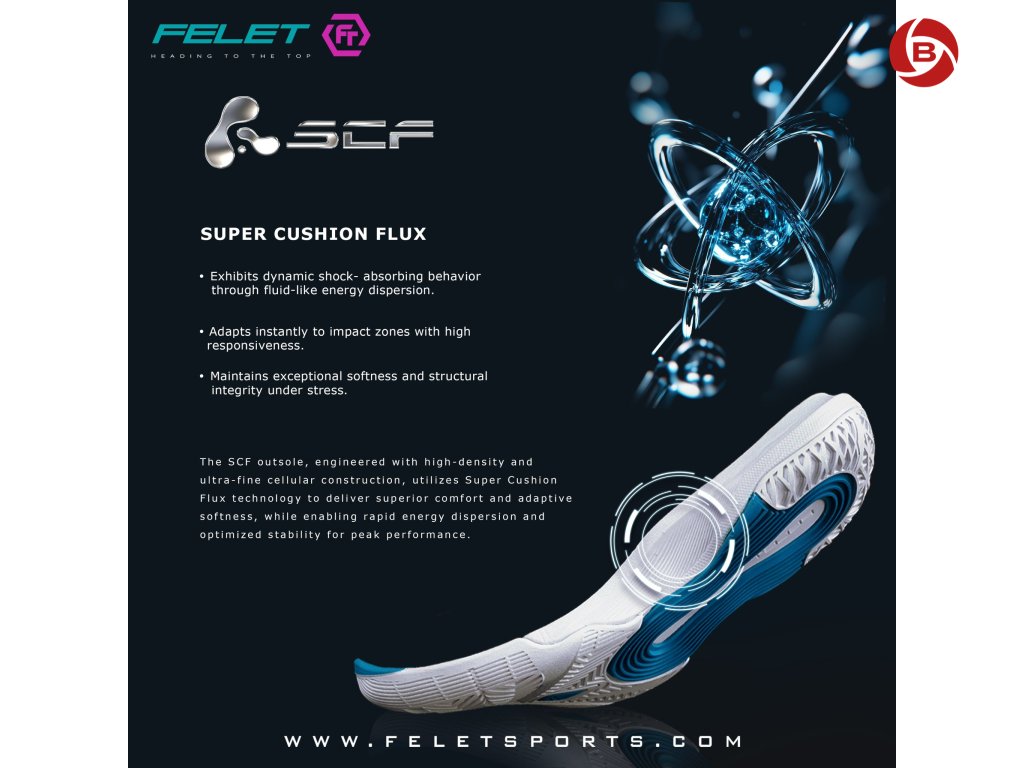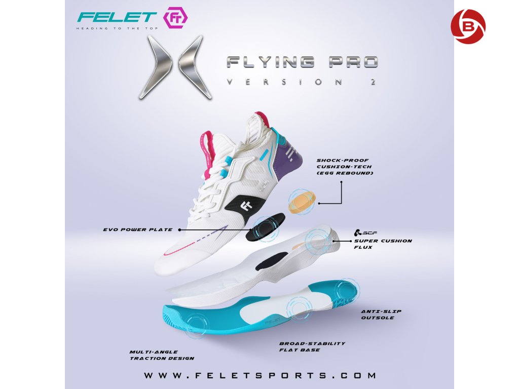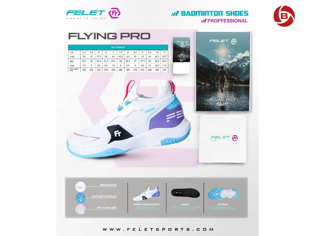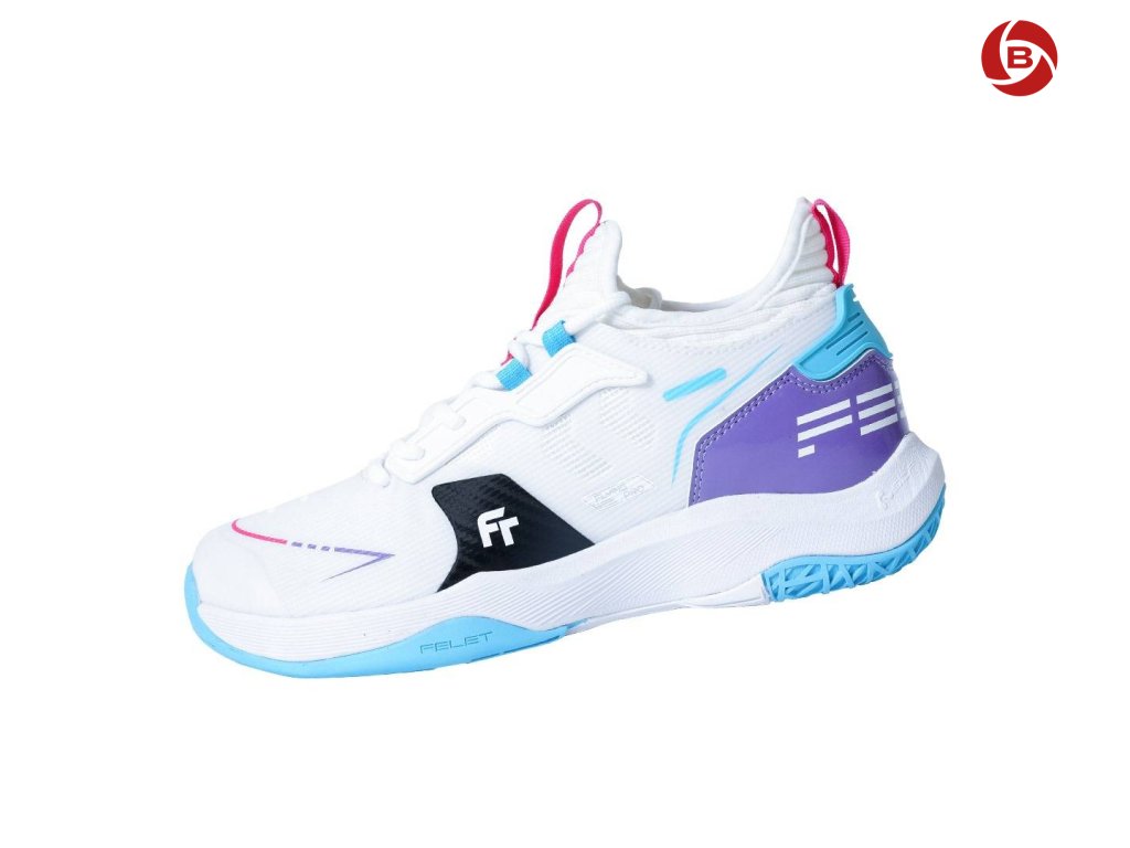 Sálová obuv Felet Flying Pro V2 White je druhá generace profesionální badmintonové obuvi navržené pro intenzivní zápasovou i tréninkovou zátěž. Tento model spojuje moderní konstrukci, pokročilé tlumicí technologie a výrazný sportovní design, který podtrhuje její turnajový charakter.
