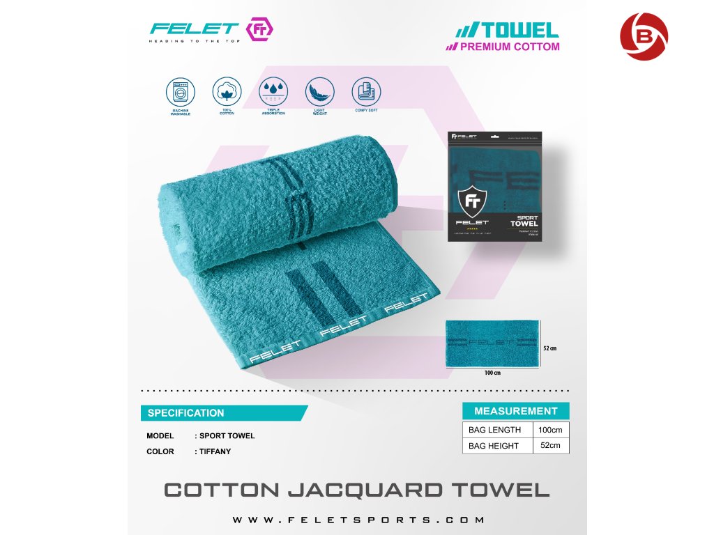 Ručník má rozměry 100 × 52 cm, což je ideální velikost pro sportovní aktivity. Stylová barva Tiffany a decentní tkané logo FELET dodávají výrobku moderní a profesionální vzhled. V balení je také praktický obal pro snadné přenášení a hygienické uskladnění.