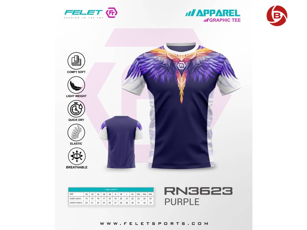 Felet RN 3623 Purple je turnajové badmintonové tričko, které přináší dokonalou rovnováhu mezi elegancí a výkonem. Tmavě fialový základ doplňuje působivý motiv roztažených křídel v kombinaci odstínů fialové, modré a zlaté – symbol síly, přesnosti a klidné sebedůvěry. Design vyzařuje odhodlání a jistotu, která doprovází každý vítězný úder.